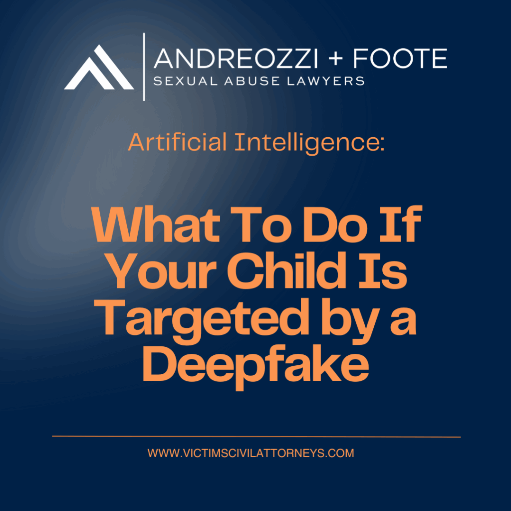 At Andreozzi + Foote, we fight to hold wrongdoers and the systems that enable them accountable. If your child has been targeted with a deepfake image, you are not powerless. We can help you take action to have those images removed, file a civil suit, and push for the policy change needed to protect others. 1-866-753-5458