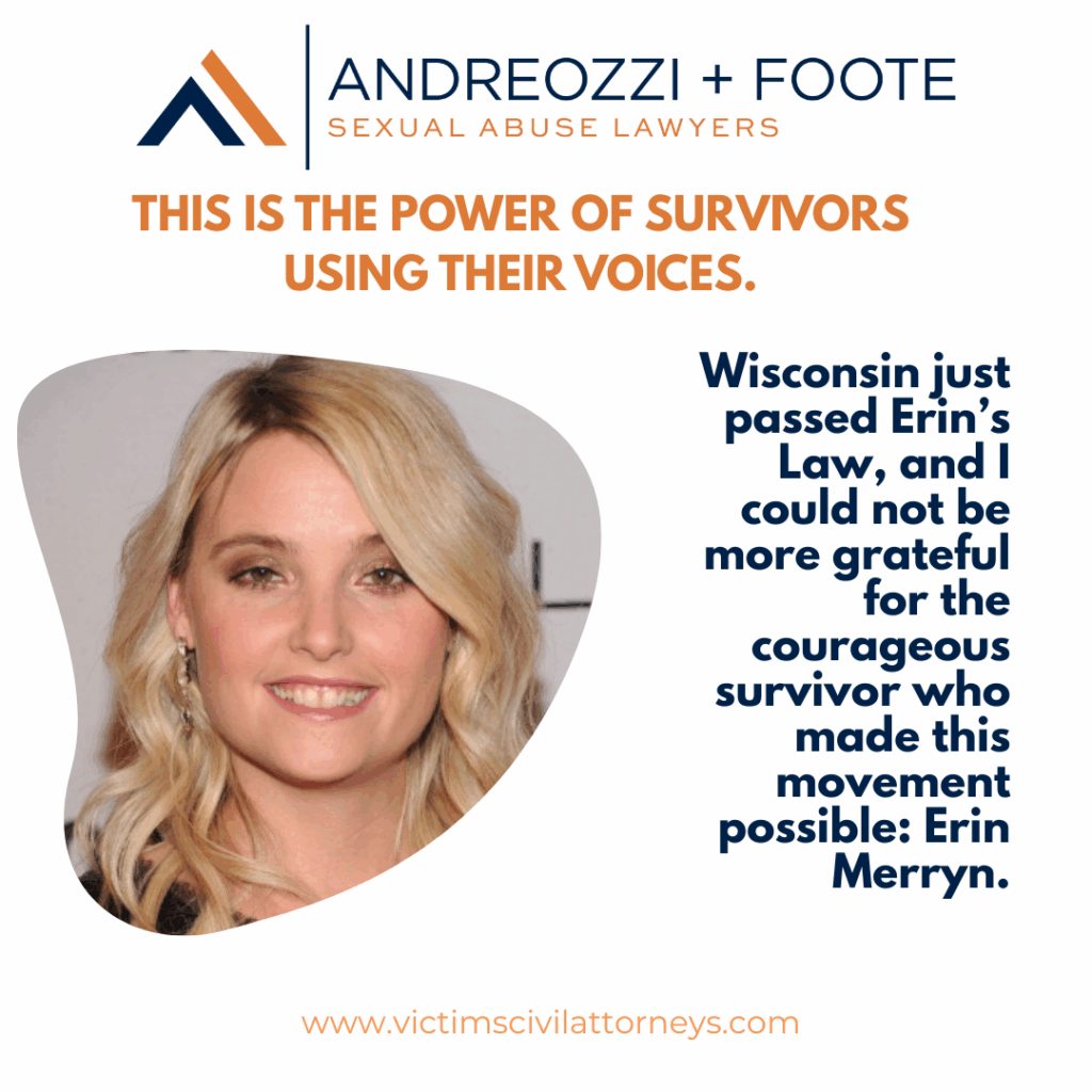 - Raise awareness. Share Erin’s story and the Wisconsin legislative win. Use hashtags like #ErinsLaw #ProtectOurKids #SurvivorAdvocate.